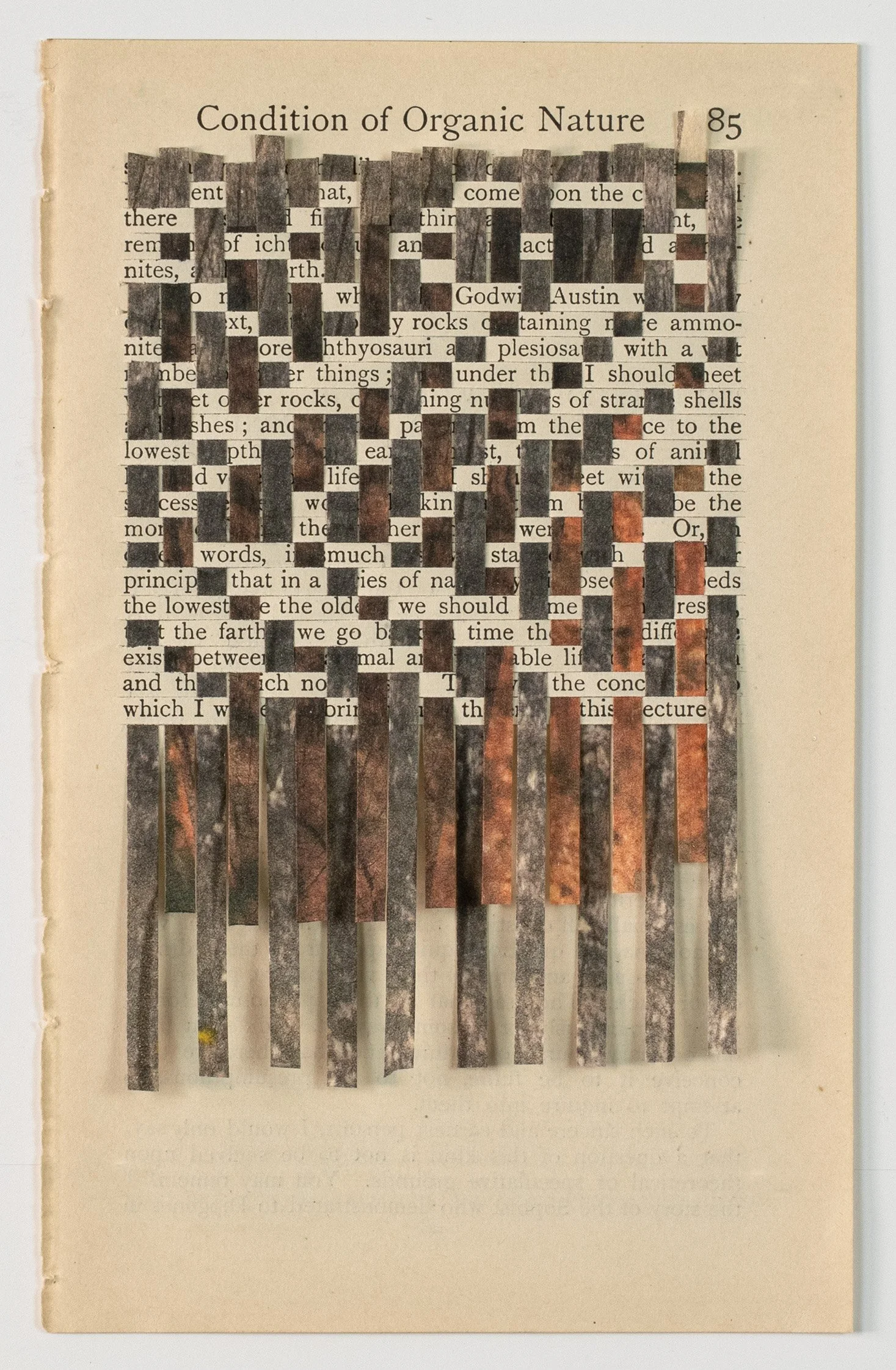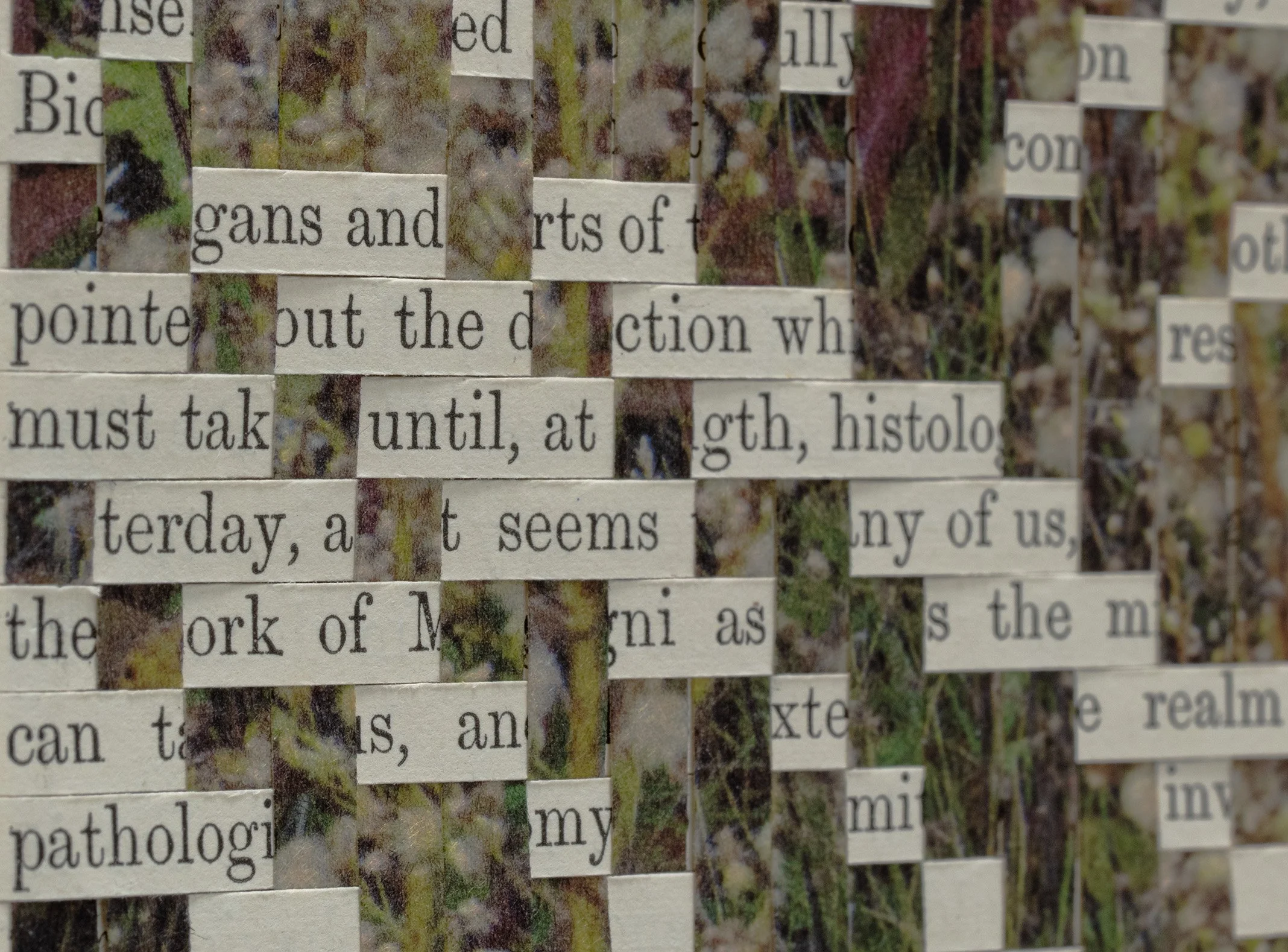 Inkjet print of a digitally altered photograph on Japanese paper, hand-cut into strips, hand woven into altered and cut book pages.