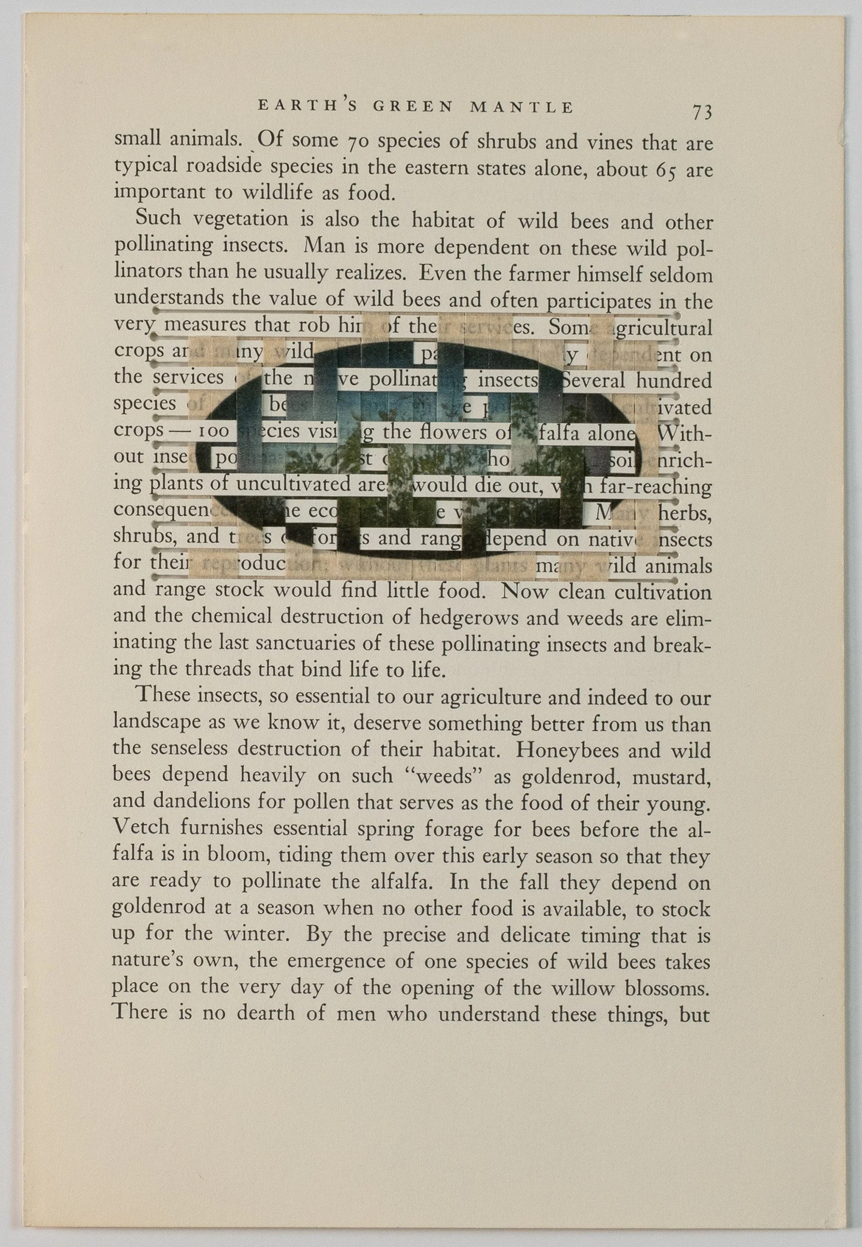 Inkjet print of natural regeneration after clear-cut logging, altered book pages, hand-weaving.