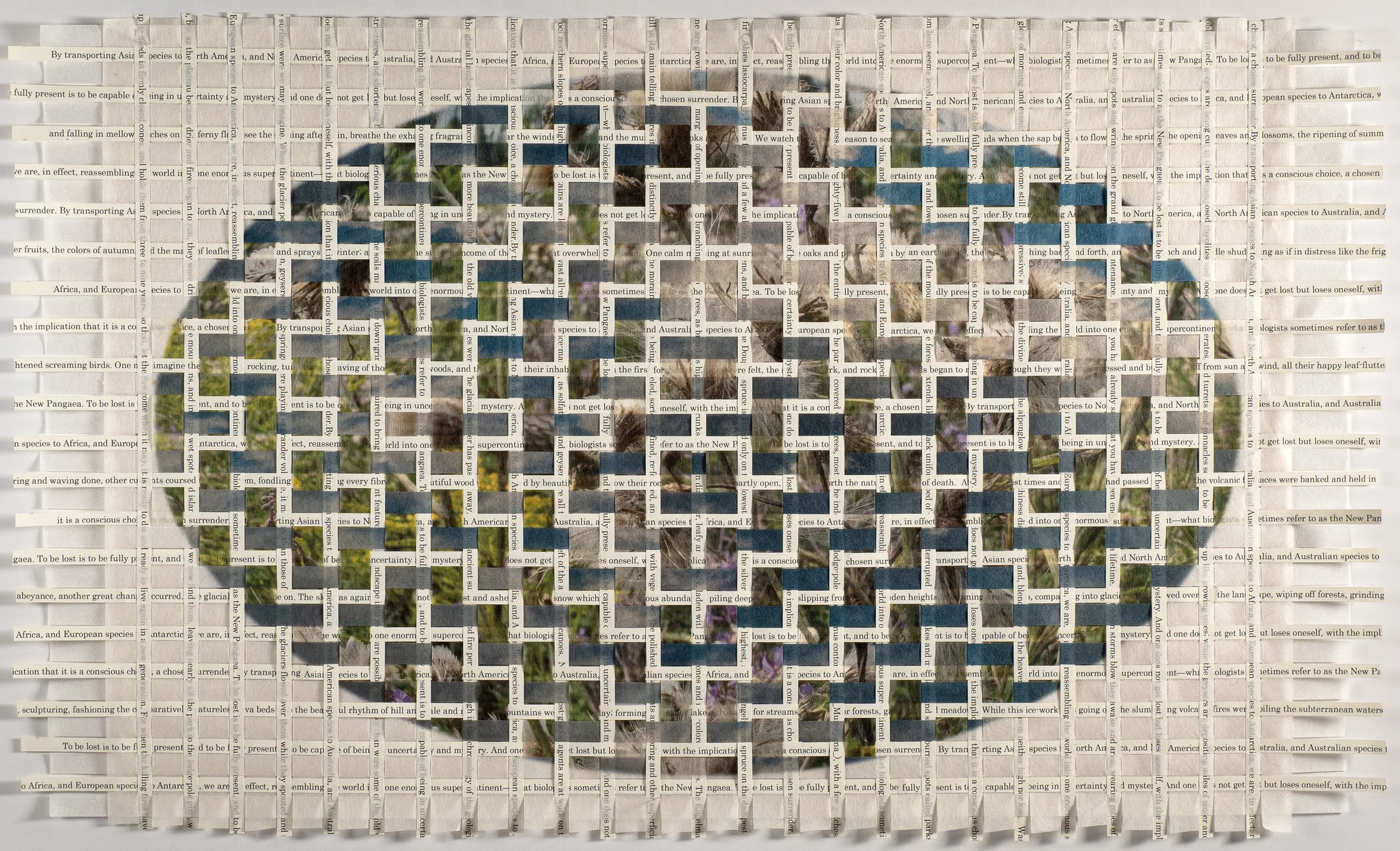 Inkjet prints of digitally altered text and photographs on Japanese and western papers, hand cut into strips, hand-weaving.
